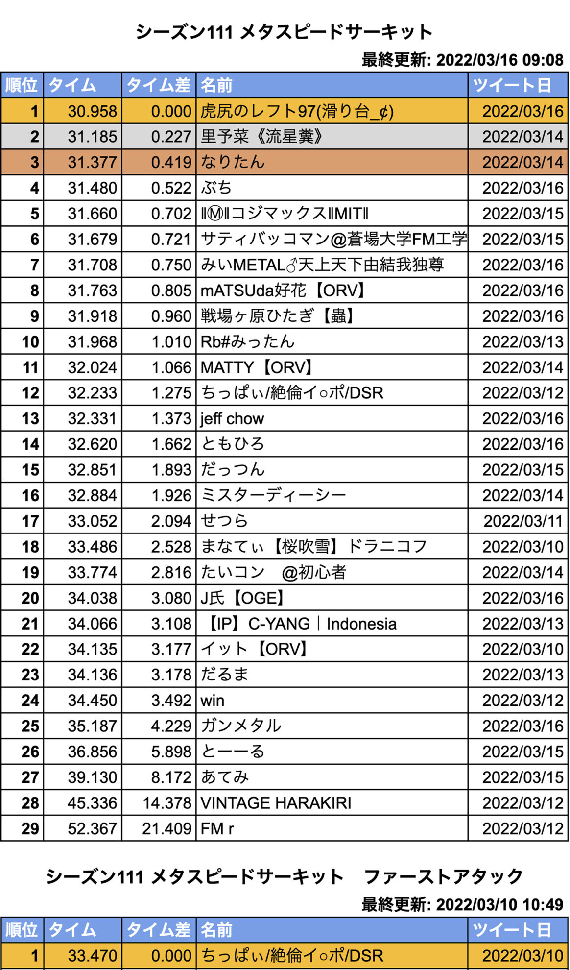 シーズン111 メタスピードサーキット 2022-03-17 最終更新日時 : 2022-03-23 サティス 本シーズンのトップは「虎尻のレフト97(滑り台_¢)」さんです!おめでとうございます? 攻略のコツとして、コーナー安定の確保をしつつパワロスを最大限盛りながらブレーキを最小限に留めたとアドバイス頂きました!