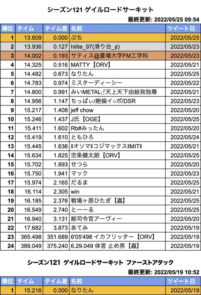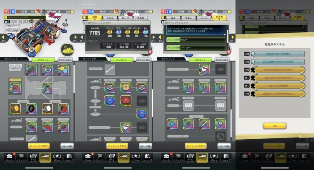 耐風については最初は新しいホイールやリヤステーで盛っていましたが、フラットディッシュやSSスタビステーの方が意外にもタイムは良かったのでそちらを採用しました。 おそらくフレイムバードでパワーが強化されたことで風で減速しにくくなったので、デジタルやスピードを盛った方が速いということなんだと思います。 コーナー安定は厳し目だったのでレーザーのハイトローラーを使ったりしましたが、耐久的には余裕がありそうだったので、最後の方は一か八かフロントステーをフル軽量エアロ、フロントホイールは大径ワンウェイWトレッドにして3レーン待ちにしてみたところ、24レース目に初日以来2回目の3レーンが来てくれてあのタイムを出すことができました。