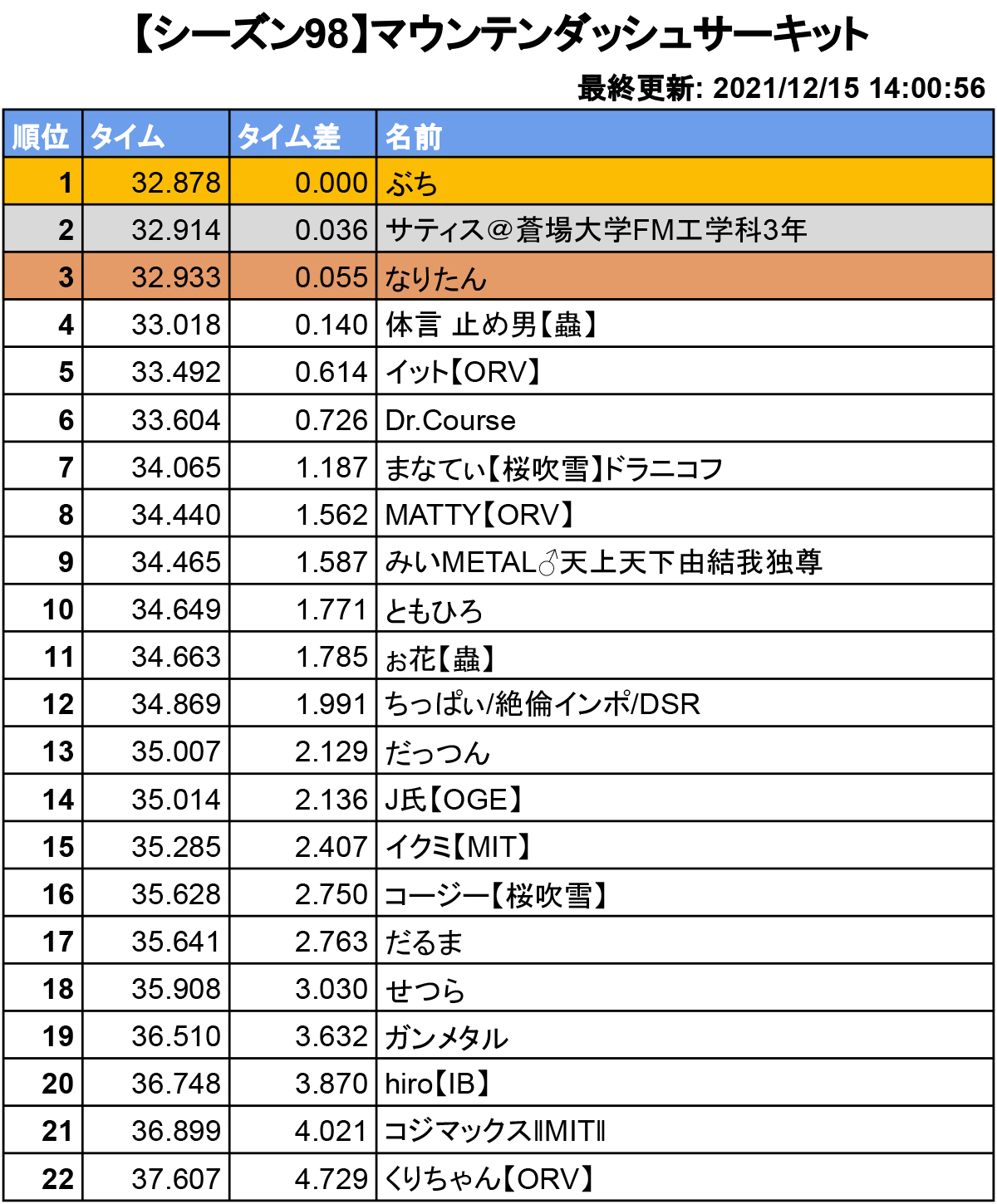 (2021.12.16追記:ランキング集計の際に集計漏れが発生してしまいました。主な理由はハッシュタグの相違、ツイート内にタイムの記載がない、の2点です。集計方法が以前と異なるため、お手数おかけしてしまいますがハッシュタグ、タイム、タイムのスクショの3点を含めたツイートをお願い致します。)